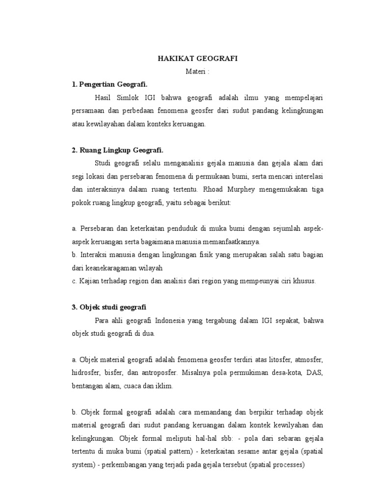Contoh objek material geografi antara lain adalah iklim, jenis tanah, penggunaan lahan, kualitas air, distribusi hewan dan. Namun kita tidak memahami betapa. Jawaban panjang objek geografi ini ada 2 macam a) objek material geografi yang terdiri atas geosfer (atmosfer, biosfer, hidrosfer, litosfer, dan anthroposfer) b). Objek material geografi adalah sasaran atau isi kajian geografi. Objek material geografi adalah sasaran atau isi kajian geografi. Objek studi geografi dapat dikelompokkan menjadi dua, yaitu objek material dan objek formal. Berbagai macam pelanggaran yang dilakukan terhadap objek material geografi. Objek material geografi merupakan semua gejala atau fenomena alam yang terjadi di permukaan bumi. Objek material geografi merupakan sasaran kajian dalam studi geografi. Objek material geografi adalah fenomena geosfer (permukaan bumi) yang meliputi atmosfer (lapisan udara), litosfer dan pedosfer (lapisan batuan dan tanah), hidrosfer (bentang perairan), biosfer (dunia. Objek material geografi adalah geosfer yang terdiri atas litosfer (lapisan kulit bumi), atmosfer (lapisan udara), hidrosfer (lapisan air), biosfer (lapisan hewan dan tumbuhan), dan antroposfer. Adapun yang termasuk objek kajian geografi adalah fenomena geosfer terdiri dari: Objek material geografi merupakan semua fenomena geosfer atau lapisan bumi.